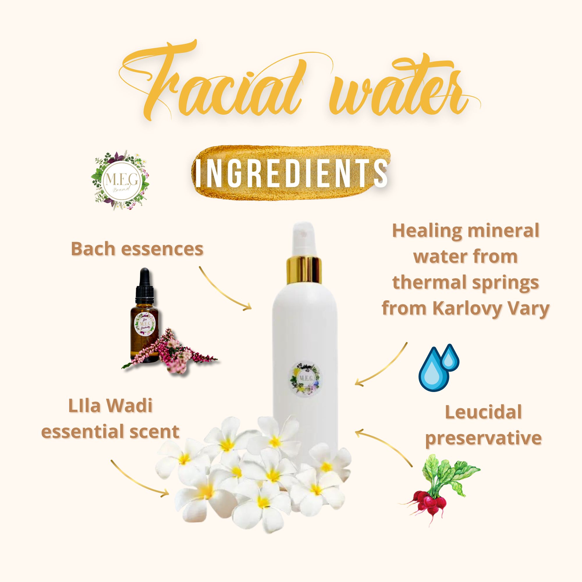 Thermal spring water from Karlovy Vary, Dr. Bach essences, preservative Leucidal, essential fragrances.